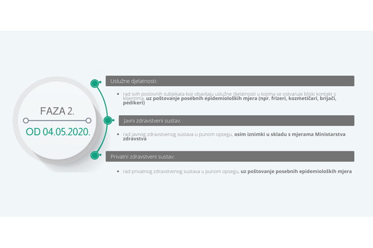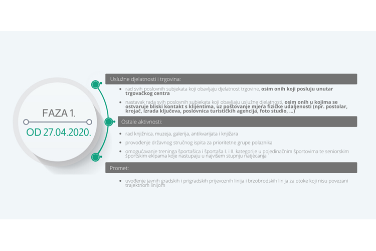 Više od svemu može se pronaći na službenoj stranici Vlade Republike Hrvatske (https://vlada.gov.hr/vijesti/mjere-za-pokretanje-gospodarskih-i-drugih-djelatnosti-odvijat-ce-se-u-tri-faze/29298).
