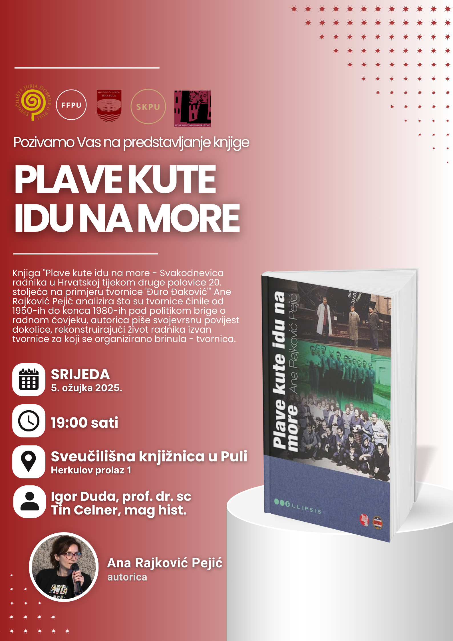 Predstavljanje knjige Ane Rajković Pejić "Plave kute idu na more: Svakodnevica radnika u Hrvatskoj tijekom druge polovice 20. stoljeća" na primjeru tvornice „Đuro Đaković“, održat će se u srijedu, 5. ožujka 2025., s početkom u 19:00 sati u Maloj čitaonici Sveučilišne knjižnice u Puli. Predstavljanje će moderirati mag. pov. Tin Celner, aktivan član Kluba studenata povijesti – ISHA Pula te bivši član Studentskog zbora, uz prof. dr. sc. Igora Dudu s Odsjeka za povijest.