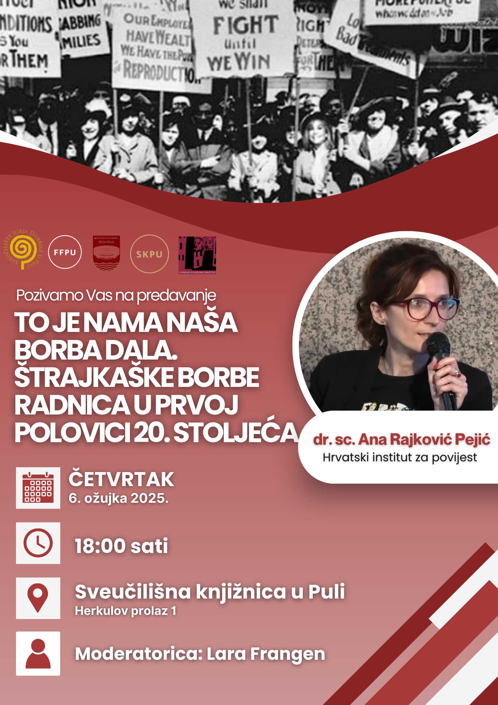 Ana Rajković Pejić održati će i idući dan 6. ožujka u 18 sati u Sveučilišnoj knjižnici u Puli predavanje pod naslovom "To je nama naša borba dala. Štrajkaške borbe radnica u prvoj polovici 20. stoljeća".